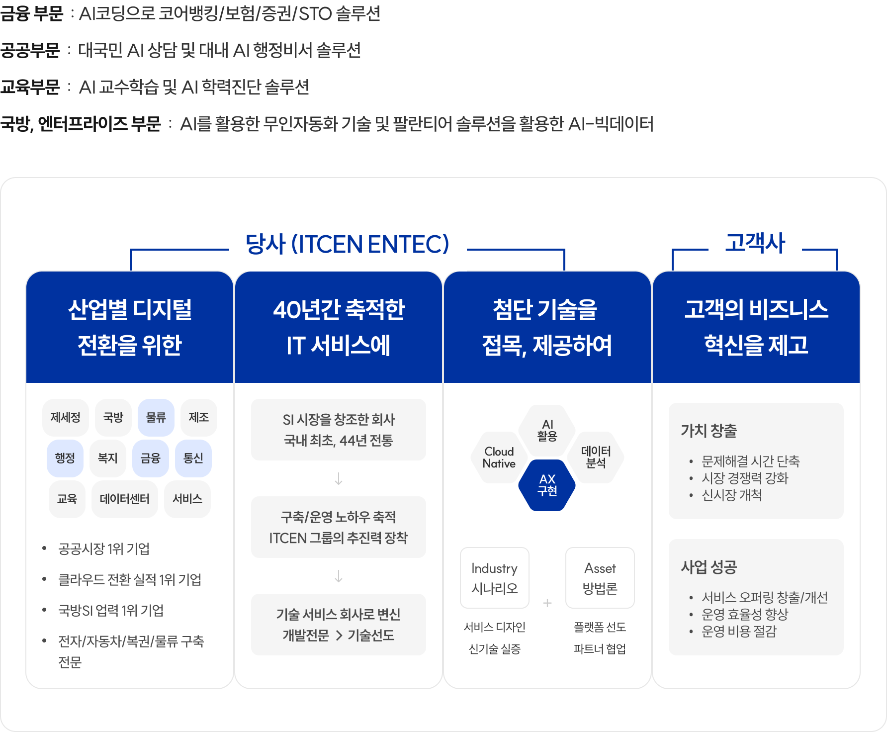 아이티센엔텍은 디지털 공공, 국방, 금융, 하이테크를 위한 전문 AX 서비스를 제공하는 기업입니다. 국내 최초 IT구축 전문기업 (최초 SI사업 등록기업, 1981년) 으로서 40년 이상 축적된 산업 전문성과 AI 기술을 접목하여 고객의 AX 혁신을 제고합니다