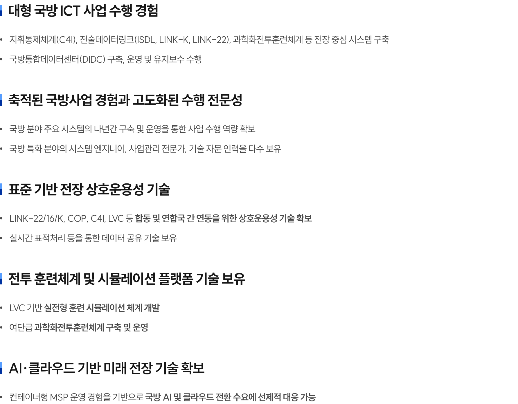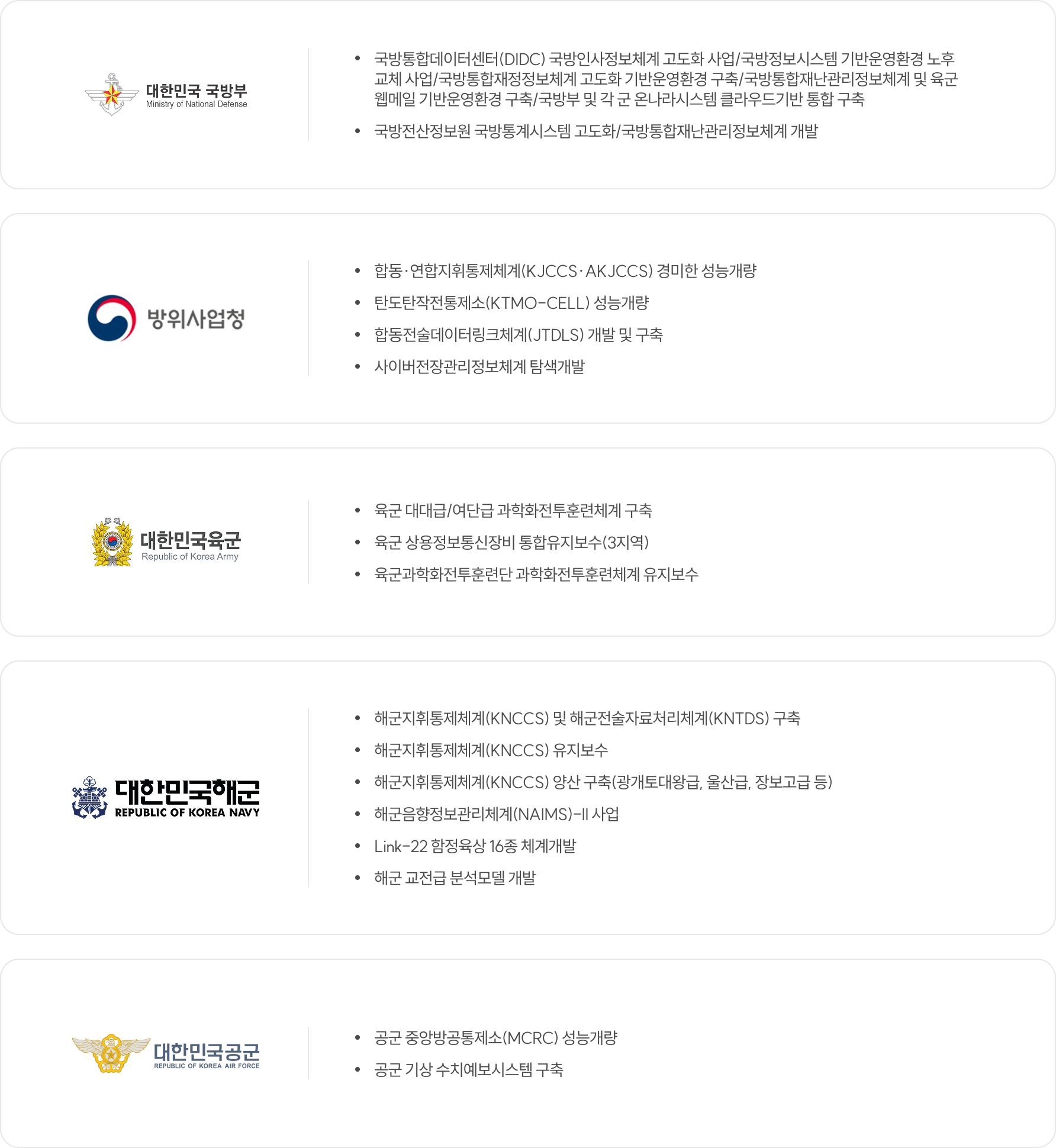 합동/연합 및 각군 C4I체계, 전술데이터링크, LVC 기반 과학화전투훈련체계, 자원관리정보체계 등 첨단기술 역량을 통해 대한민국의 디지털 자주 국방 실현을 지원합니다.