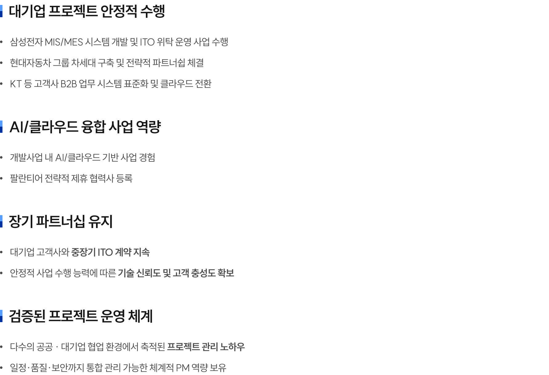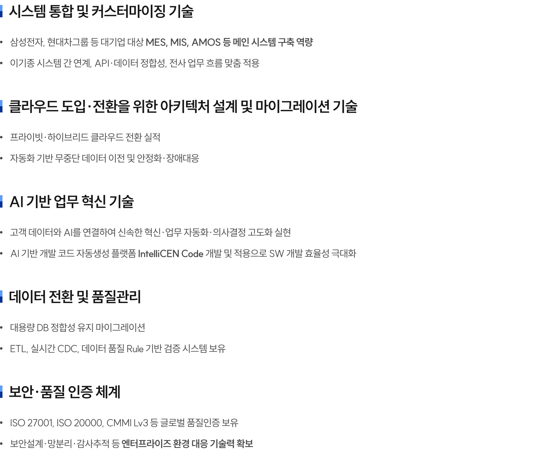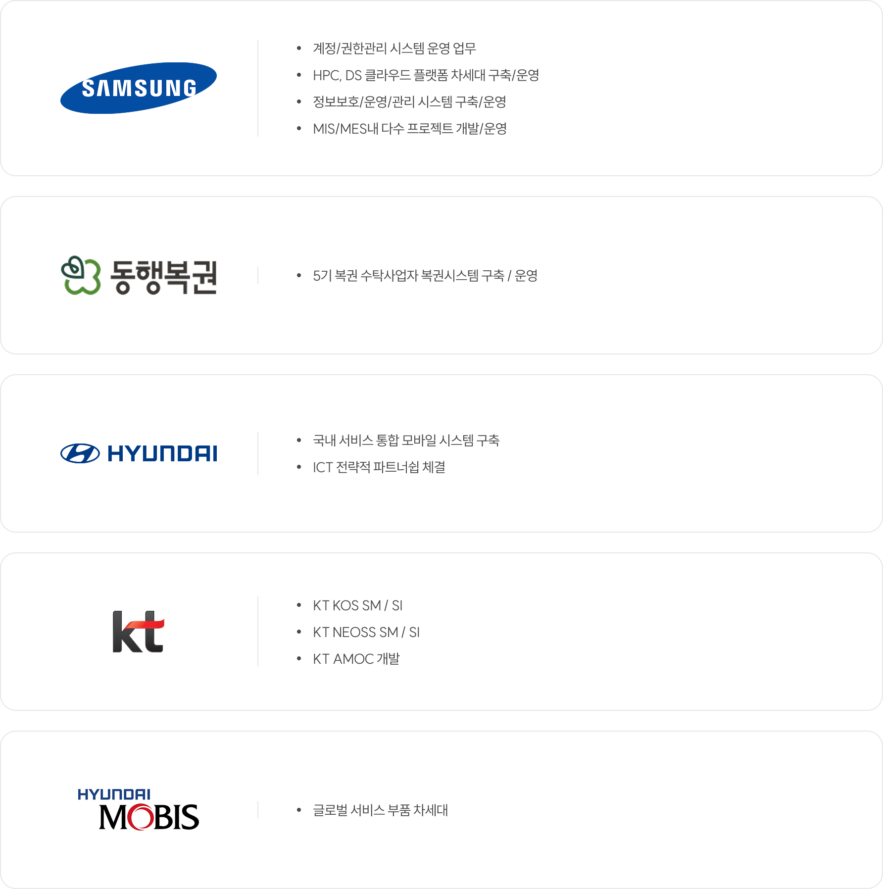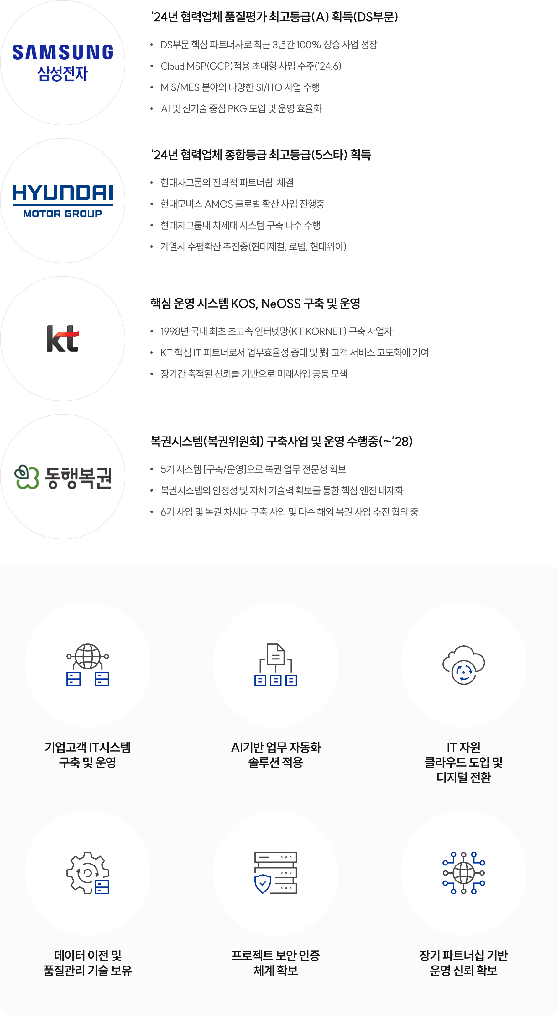 시스템 통합(SI), 클라우드 이전, 인프라 구축, AI/데이터 기반 서비스 등 전주기 IT 서비스를 제공하며