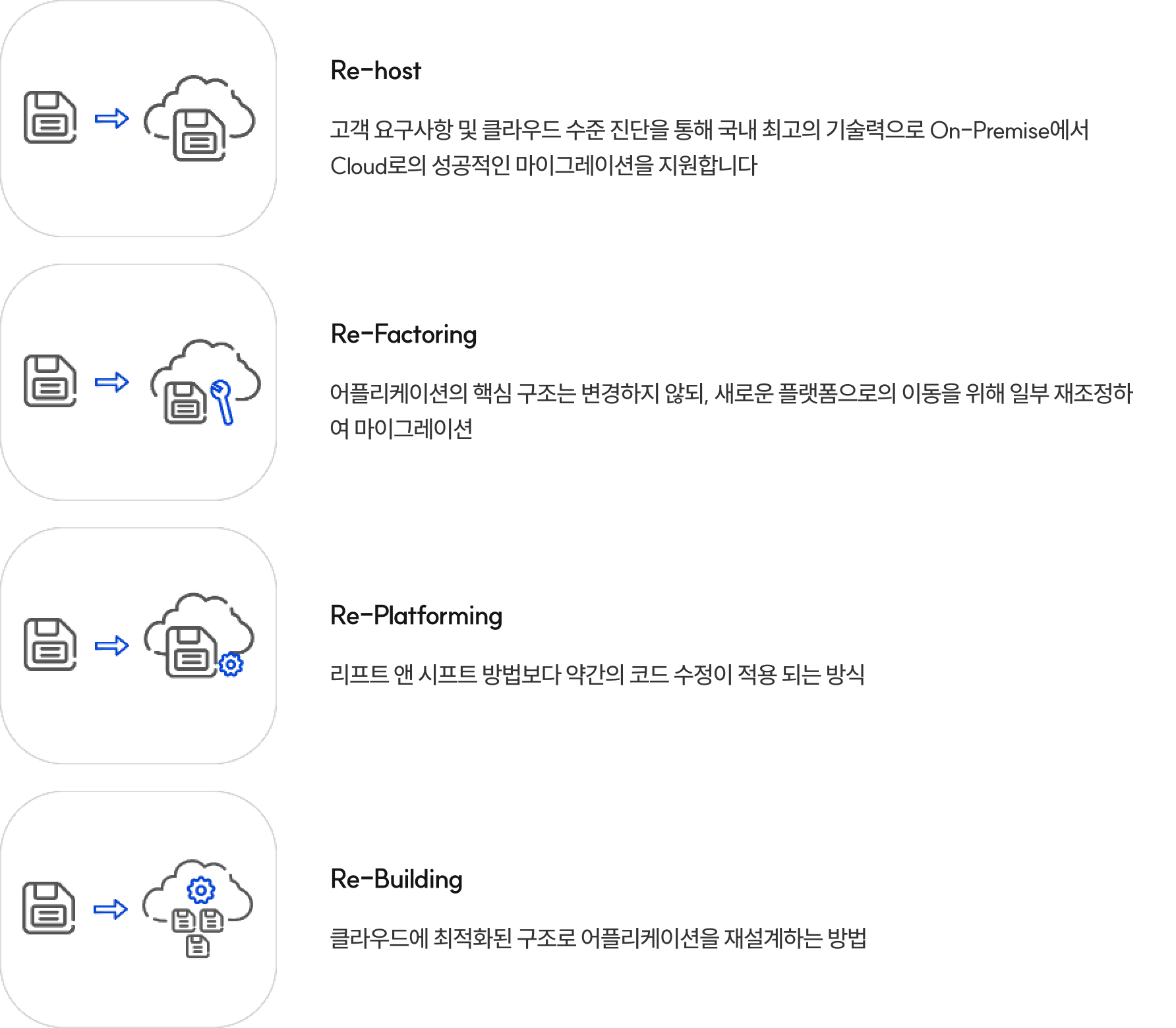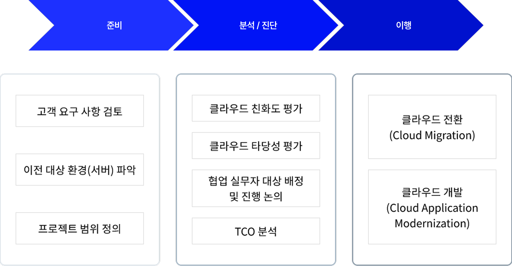 고객 요구사항 및 클라우드 수준 진단을 통해 국내 최고의 기술력으로 On-Premise에서 Cloud로의 성공적인